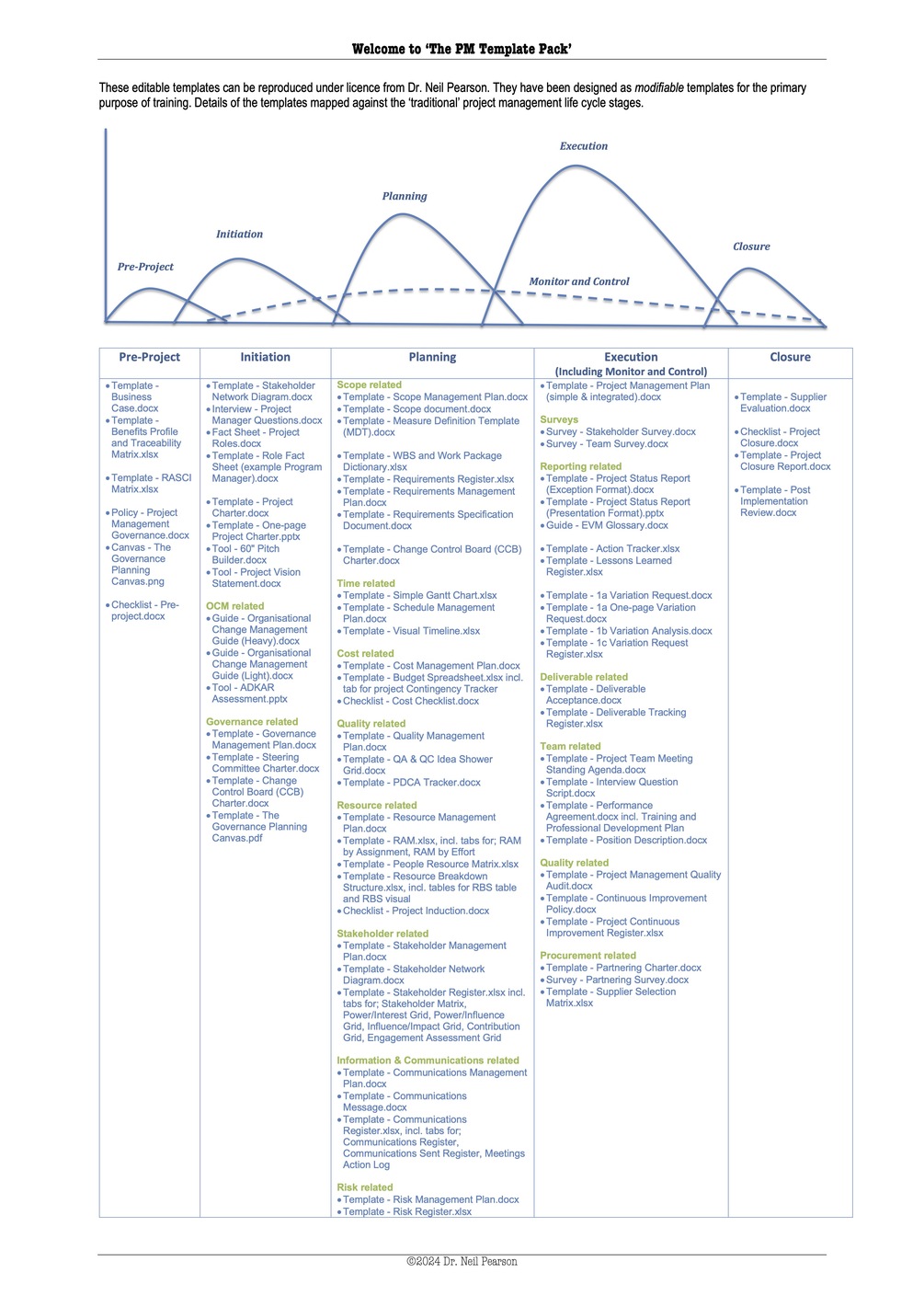Dozens of project management templates to assist students in completing coursework as a part of for example, a diploma or university degree.